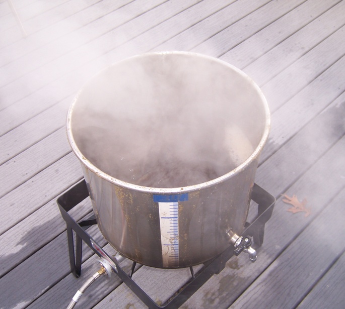 I poured the liquor from my mash tun into my boiling pot. We did have a bit of a boil over after the first edition of hops, but we pulled the heat down in time before a huge mess was made. The rest of the boil was fine. We drank Wachusett Black Shack Porters while we kept an eye on the pot.