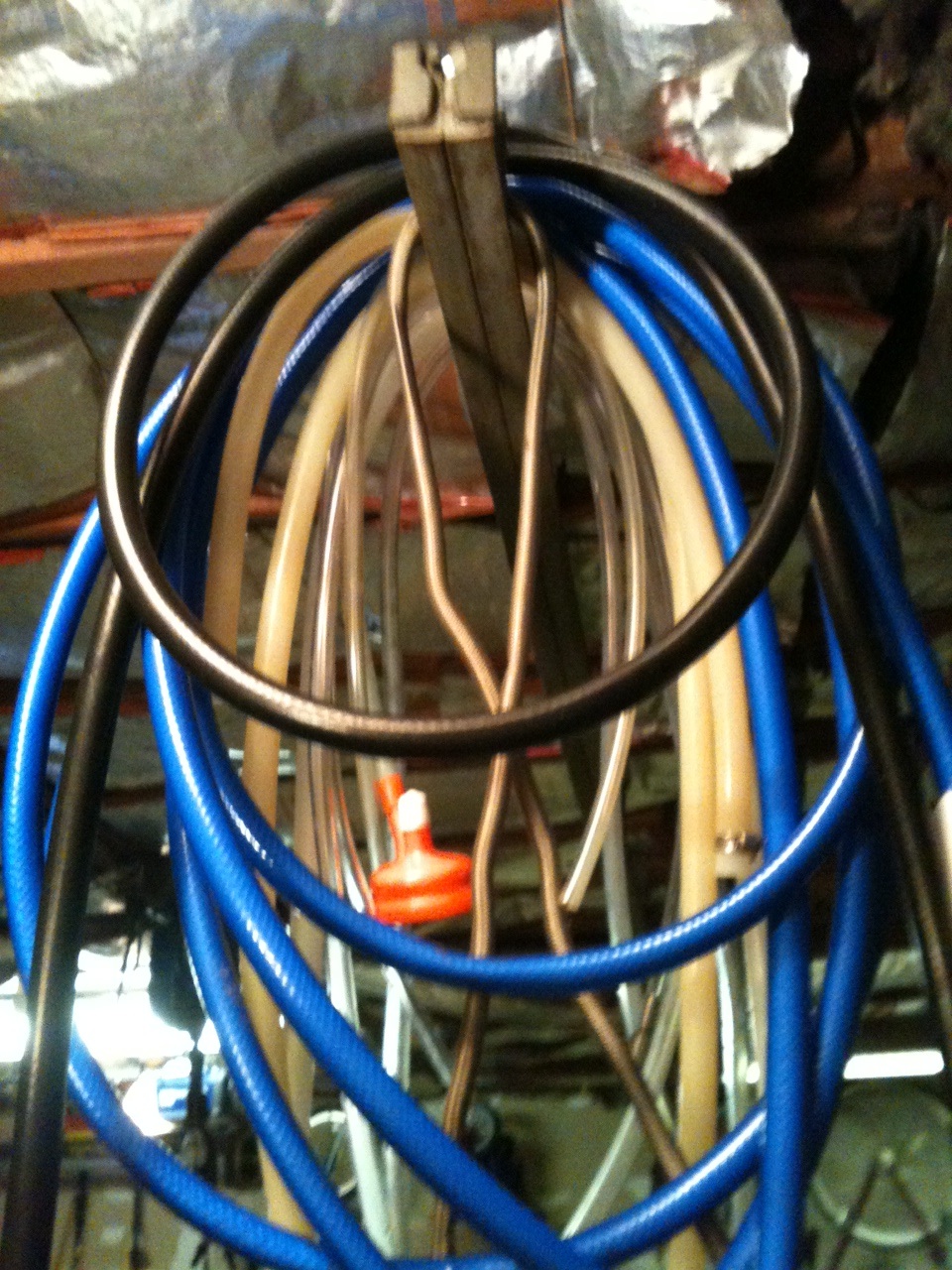 Brewing Hose Nightmare By Mike On August 6, 2012 In Equipment I have too many brewing hoses. I need a hose hanger solution. How many brewing hoses do you have? My brew hoses dangling on the overhead gantry track in my garage. Previous Merkur Hops Next Berry Wheat Tastings 1 Comment Add Comment → KISS Brew It’s clear from the picture that I don’t have as many brewing hoses as you. My father-in-law has an awful lot, and he uses Gecko’s Toes. I think he bought them from Lee Valley. Awesome hose hanging solution. You should check it out. August 6, 2012 Leave a ReplyYour email address will not be published. Required fields are marked *Comment * Name * Email * Website Δ This site uses Akismet to reduce spam. Learn how your comment data is processed.