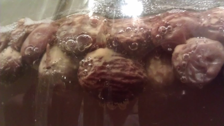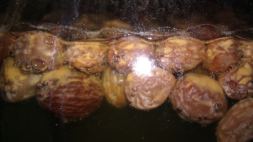 This year, they were added whole and as they were. No steaming – I was hoping the yeasts that were on the raisins made it into the cider.
